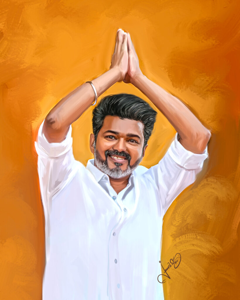 A vibrant, painterly portrait of a young man with a warm smile, featuring textured dark curly hair and a neatly trimmed beard. He is wearing a crisp white collared shirt, and a gold chain is visible around his neck. A small, bright red bindi on his forehead adds a cultural touch. The background is a soft, artistic blend of blues, purples, and subtle greens, creating a gentle gradient. The style resembles digital painting or vector art, with smooth transitions and subtle detailing.